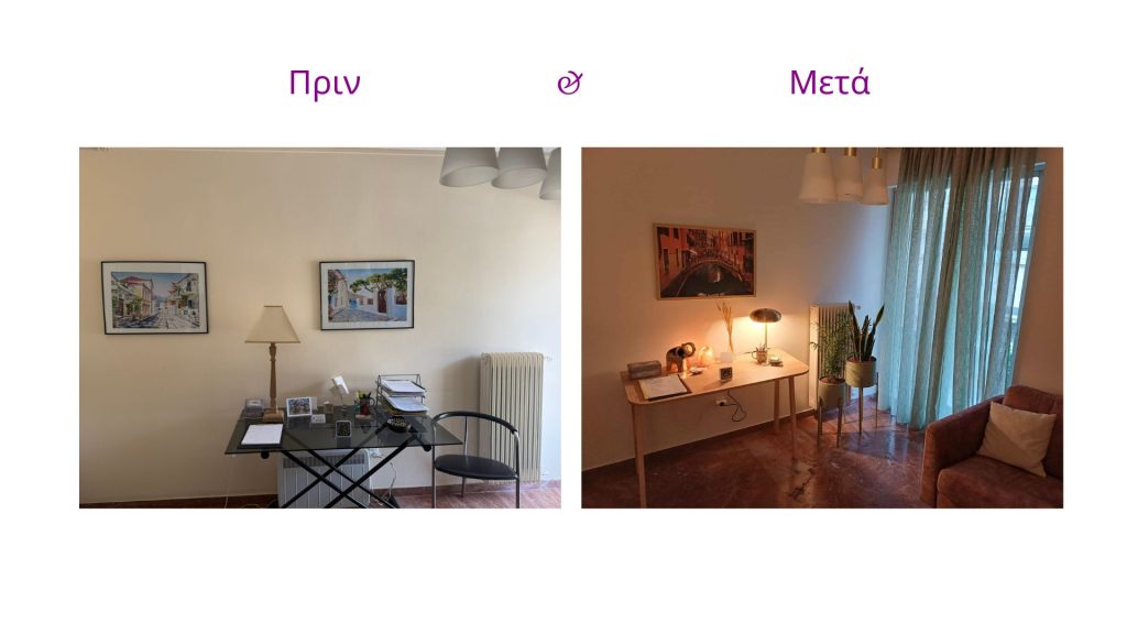 Μετά την διακοσμητική ανακαίνιση, το γραφείο στη Γλυφάδα εκπέμπει ηρεμία και φροντίδα. Η αναβάθμιση της διακόσμησης, ο νέος φωτισμός και οι γήινες λεπτομέρειες δημιούργησαν έναν χώρο που υποστηρίζει ουσιαστικά τις συνεδρίες και κάνει τον θεραπευόμενο να νιώθει πραγματικά άνετα.
